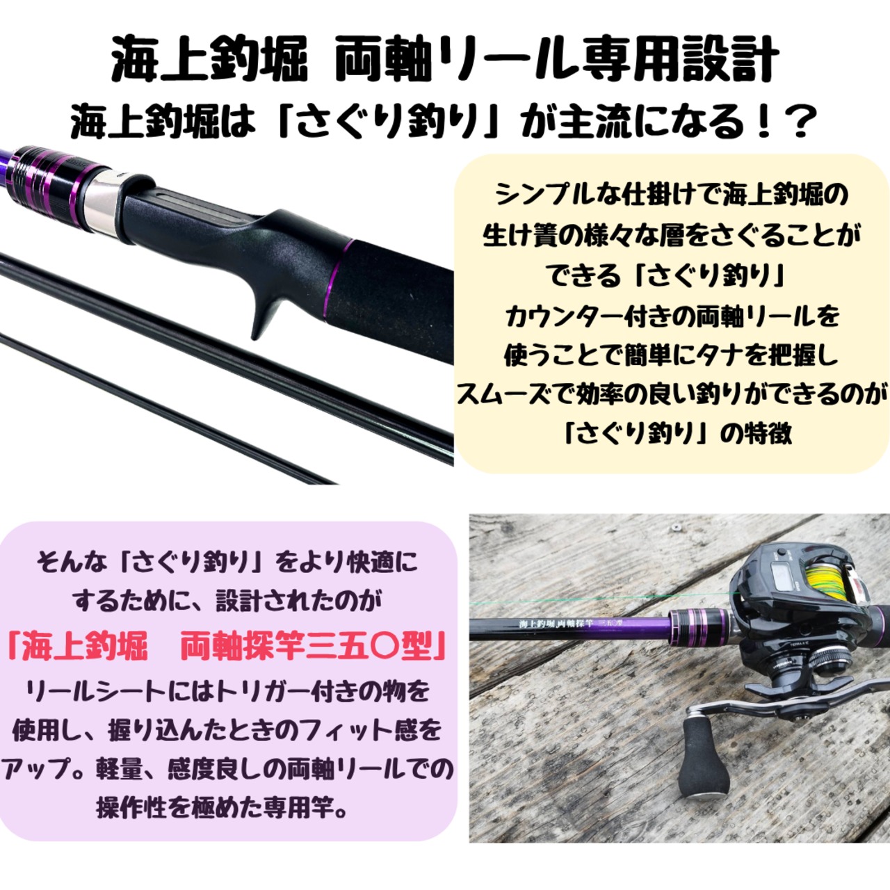 海上釣堀好きスタッフが考案し、実際に試行錯誤を繰り返しながら、脈釣り(さぐり釣り)や両軸リールが初めての方でも扱いやすい性能と専門性